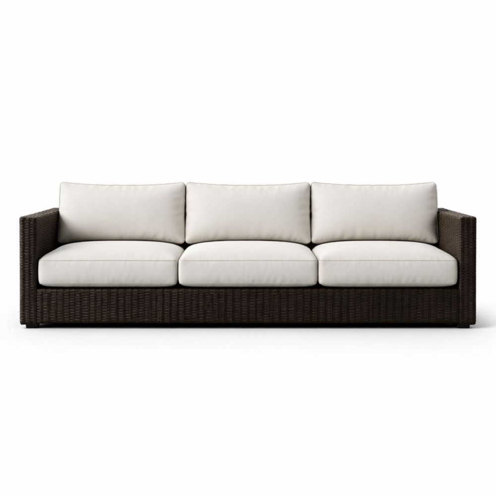 Divano 3 posti in rattan marrone con cuscini in tessuto crema