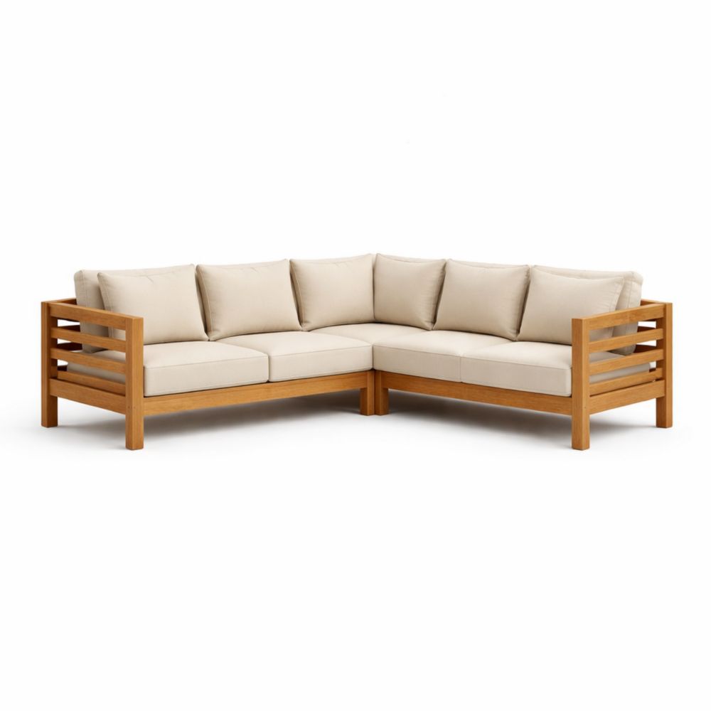 Divano angolare in legno con cuscini beige