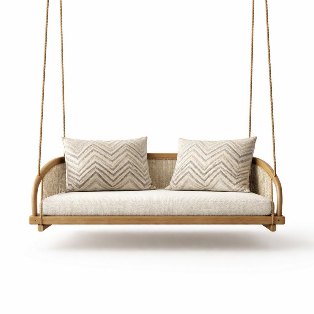 Dondolo Sospeso in Legno e Rattan con Cuscini Beige
