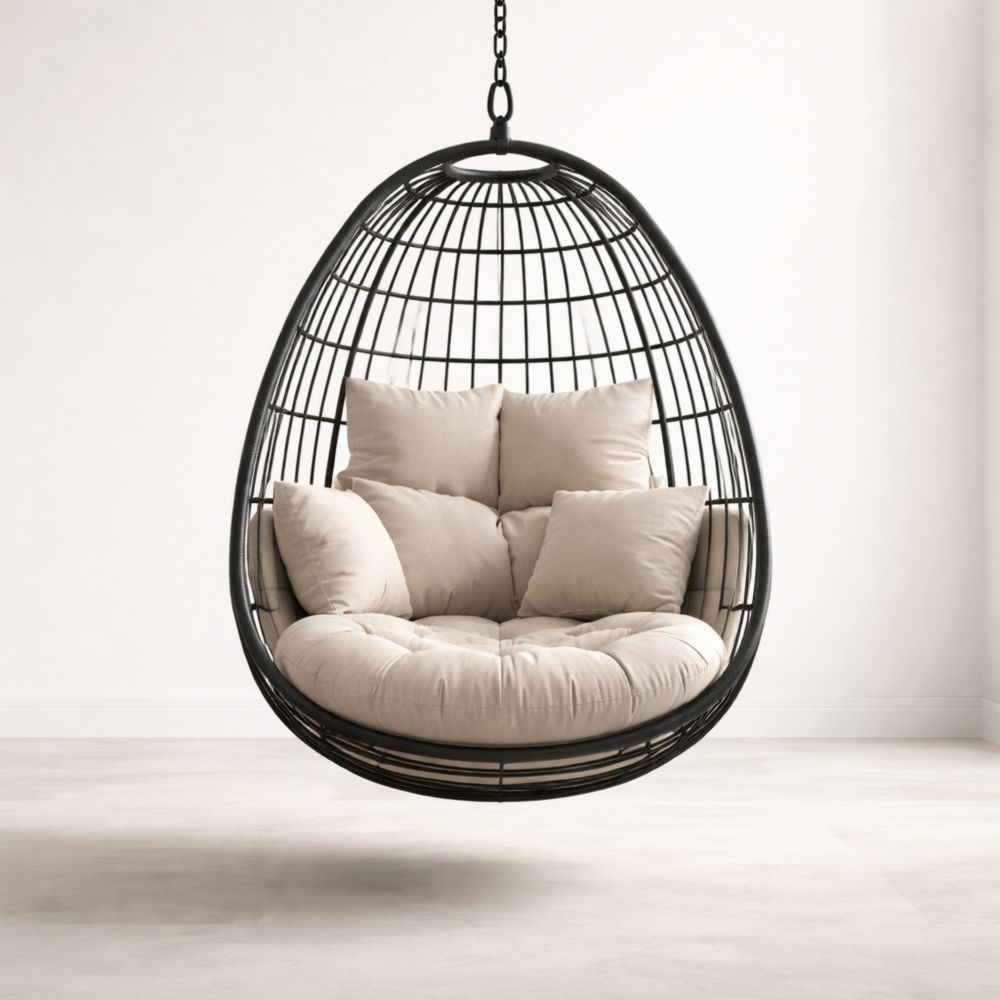 Poltrona Sospesa a Forma di Uovo in Metallo con Cuscini Beige
