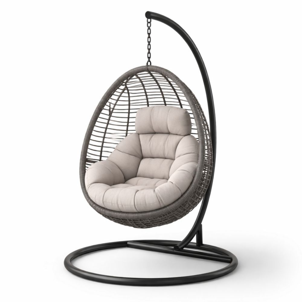 Poltrona Sospesa in Rattan Marrone con Struttura in Acciaio Nero e Cuscino Grigio