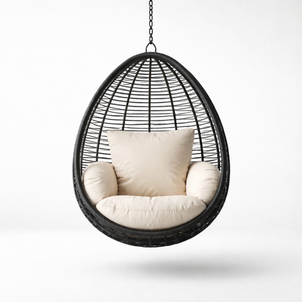 Sedia Sospesa in Rattan PE Nero con Cuscino in Poliestere Crema